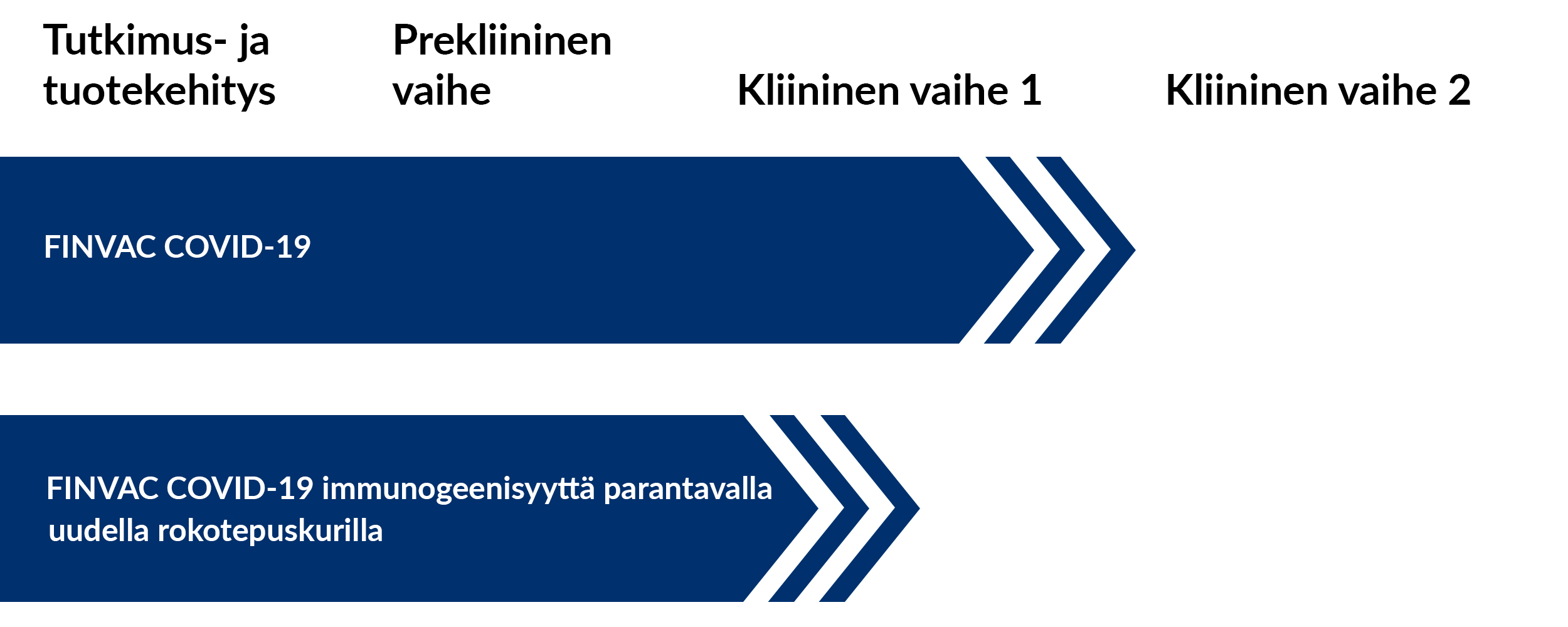 Ensimmäinen FINVAC-rokotealustaa käyttävä rokote, FINVAC COVID-19, on nenään annettava SARS-CoV-2-rokote, joka on parhaillaan siirtymässä toiseen kliiniseen tutkimukseensa